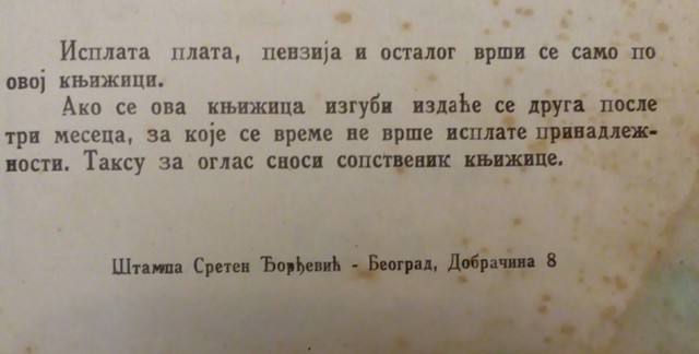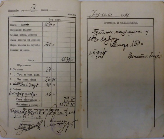 Висина плате уписивала се у платну књижицу, као и сви подаци о породичном додаткуна скупоћу. Уписивани су путни трошкови, порез и чланарина за пензиони фонд. Иземеђу осталих података у платној књижици из 1934.године назначена је и положајна група чиновника приправника.