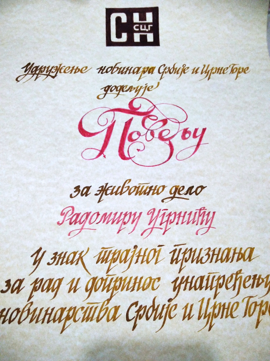 Повеља за животно дело.